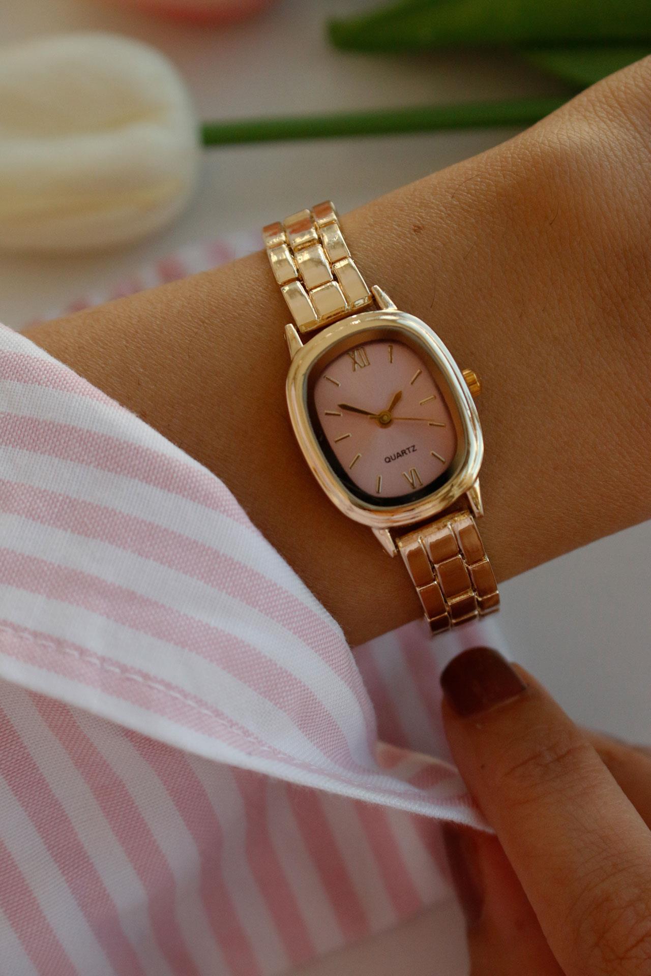 • Zarif Vintage TasarımBonjour Gold Metal Kadın Kol Saati(pudra kadran),metal kordonuyla tüm kombinlerinizle severek kullanacaksınız.