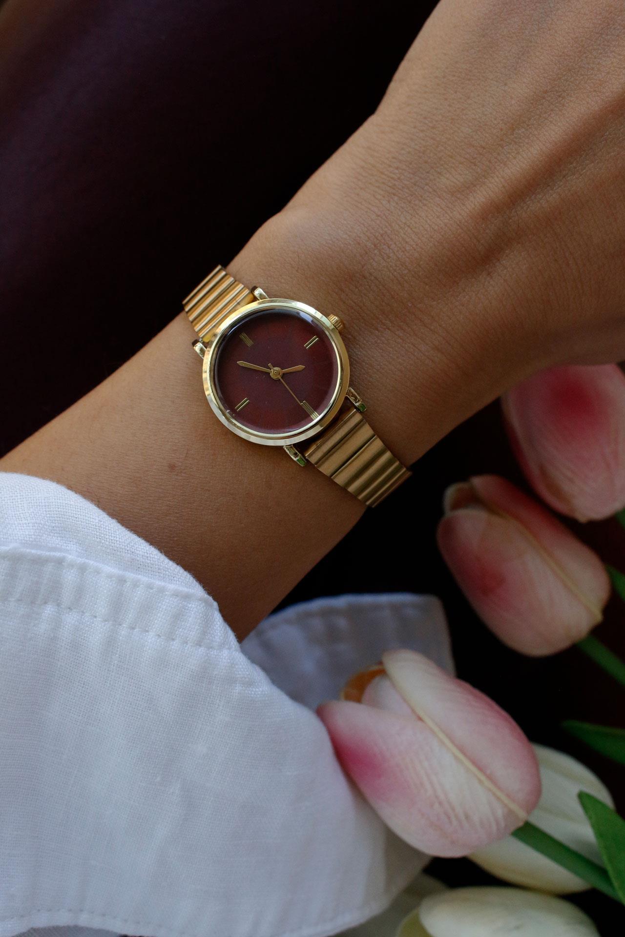 • Zarif Vintage Tasarım: Ravel Çelik Yuvarlak Kadın Kol Saati(bordo kadran)gold kasası ve metal kordonuyla stilinize seçkin bir dokunuş katar .